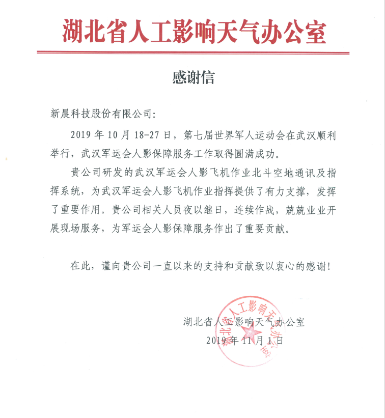 湖北人工影响天气办公室军运会感谢信